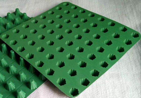 1、排水板沿車庫頂板的擋土墻開始順坡鋪設,邊緣支點相互搭接1-2個支點;或不搭接而涂膠水粘接,使排水板形成一個整體,既排水,又起到隔根的作用,同時還是一個輔助的防水層,形狀根據現場情況任意裁剪。